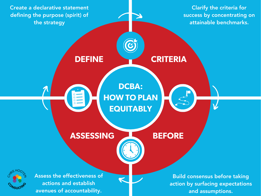 To reiterate, DCB is a double acronym that refers to both a process and a concept that aims to reduce bias and harm by inviting consensus-building and outlining purpose and accountability within a shared endeavor. I have created and articulated the DCBA process to shift organizations away from the status quo of assessing before criteria have been defined. Research confirms inequitable power dynamics rely on the intentional lack of explicitly stated and agreed-upon parameters. I hope that the DCBA process encourages you to plan intentionally and democratically so that access and equity are centered.